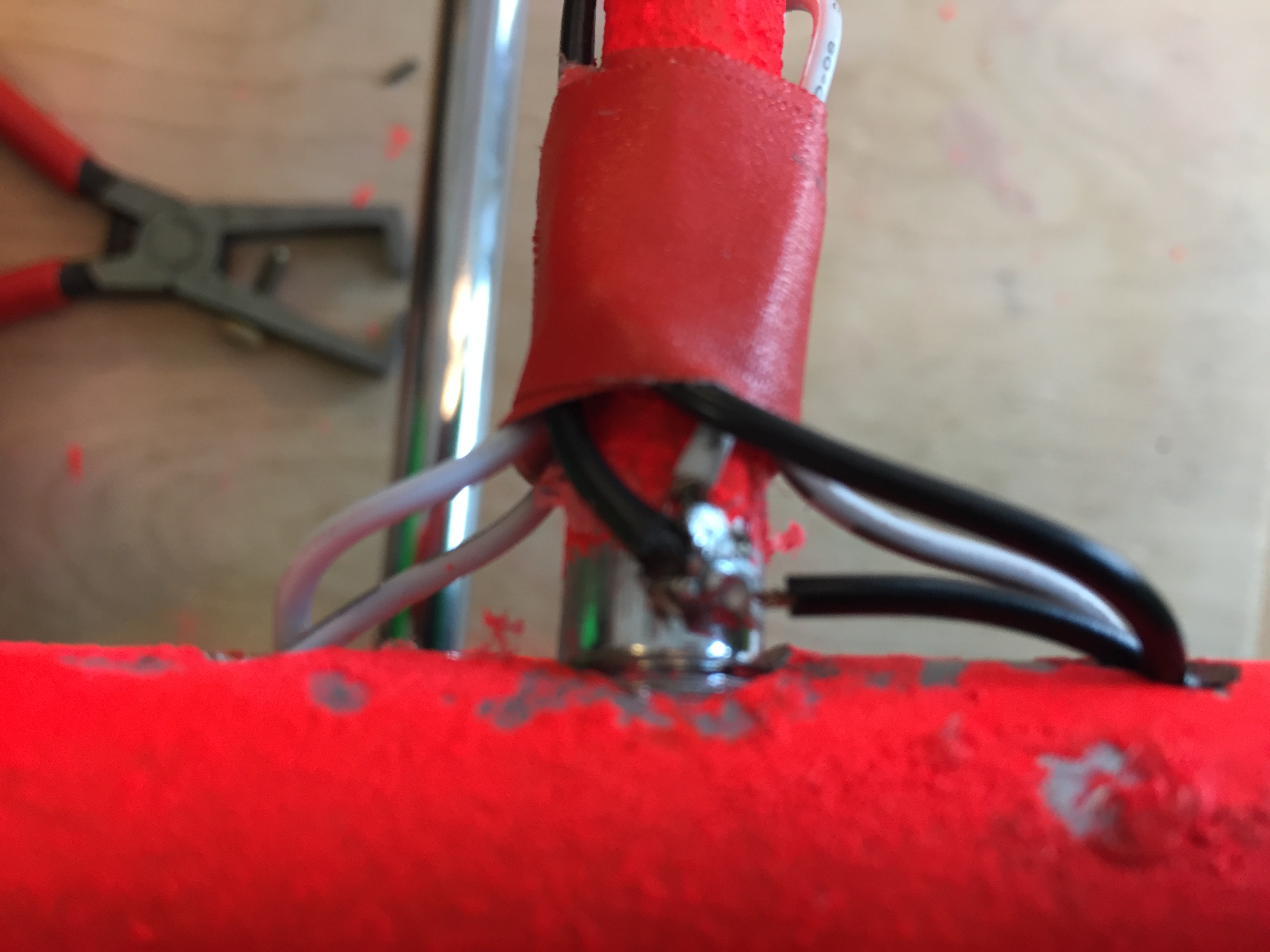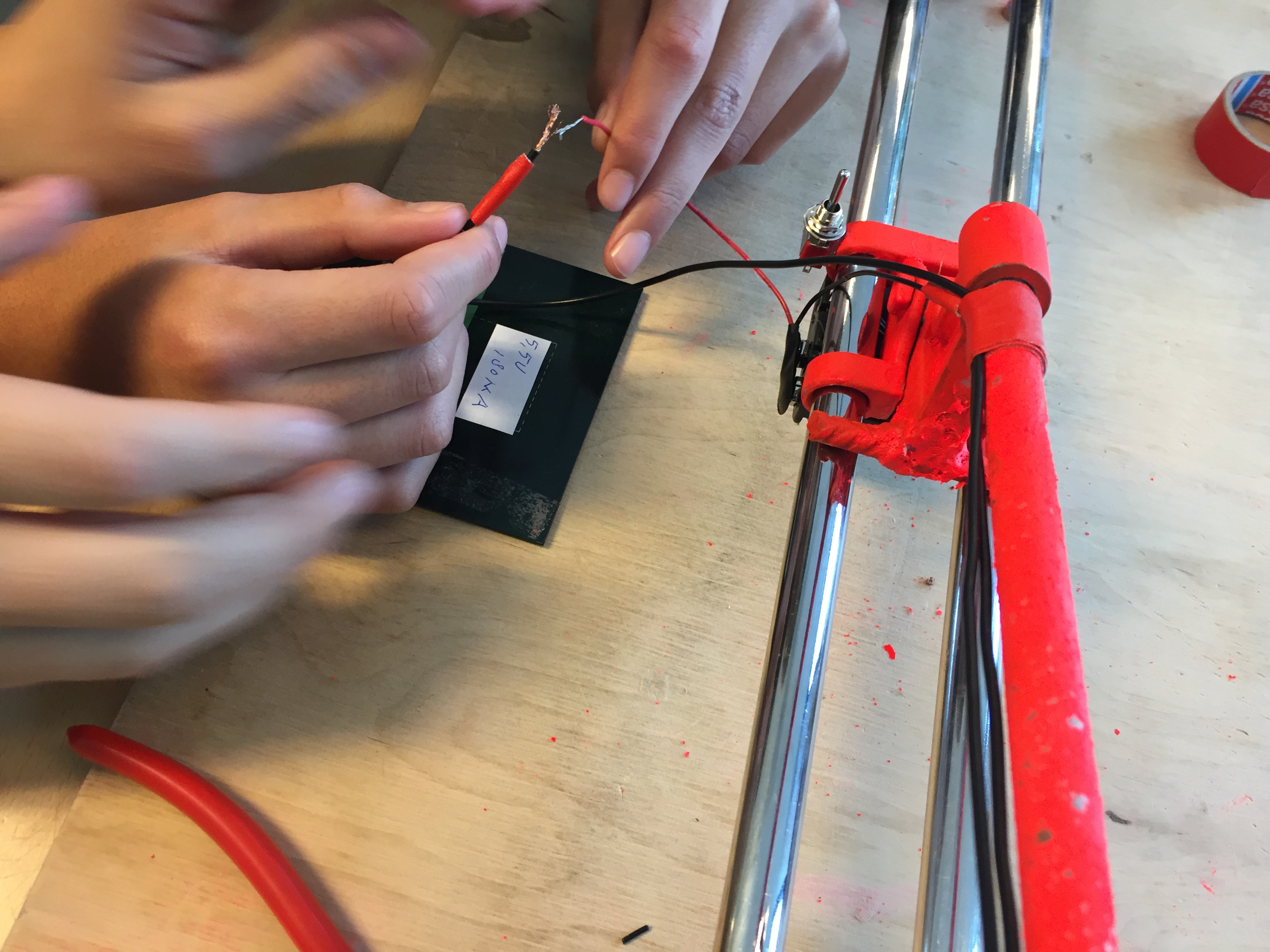 nu we een ontwerp hadden en alle materialen konden we gaan bouwen, we hadden nog wat buizen nodig om de draden doorheen te laten lopen maar gelukkig is de nieuwbouw van de school nog niet af en lag er buiten wat resten metaal dat we hebben gebruikt.